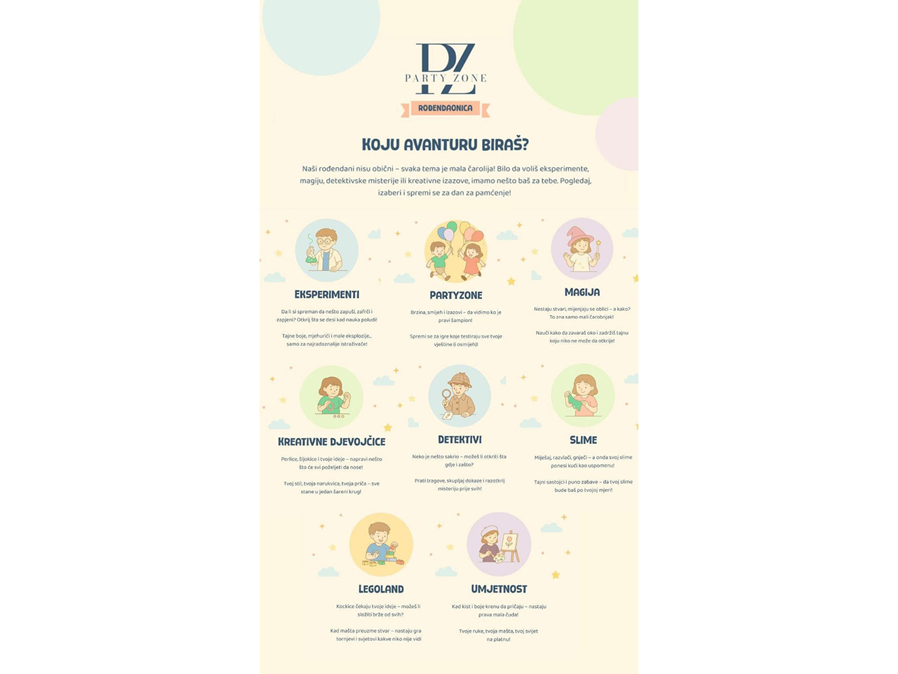 Свака прослава је посебна авантура, од слиме радионица, узбудљивих експеримената и детективских мисија, па све до креативних и умјетничких изазова. Наш тим се брине да свако дијете пронађе тему по својој жељи и ужива у дану који ће памтити.